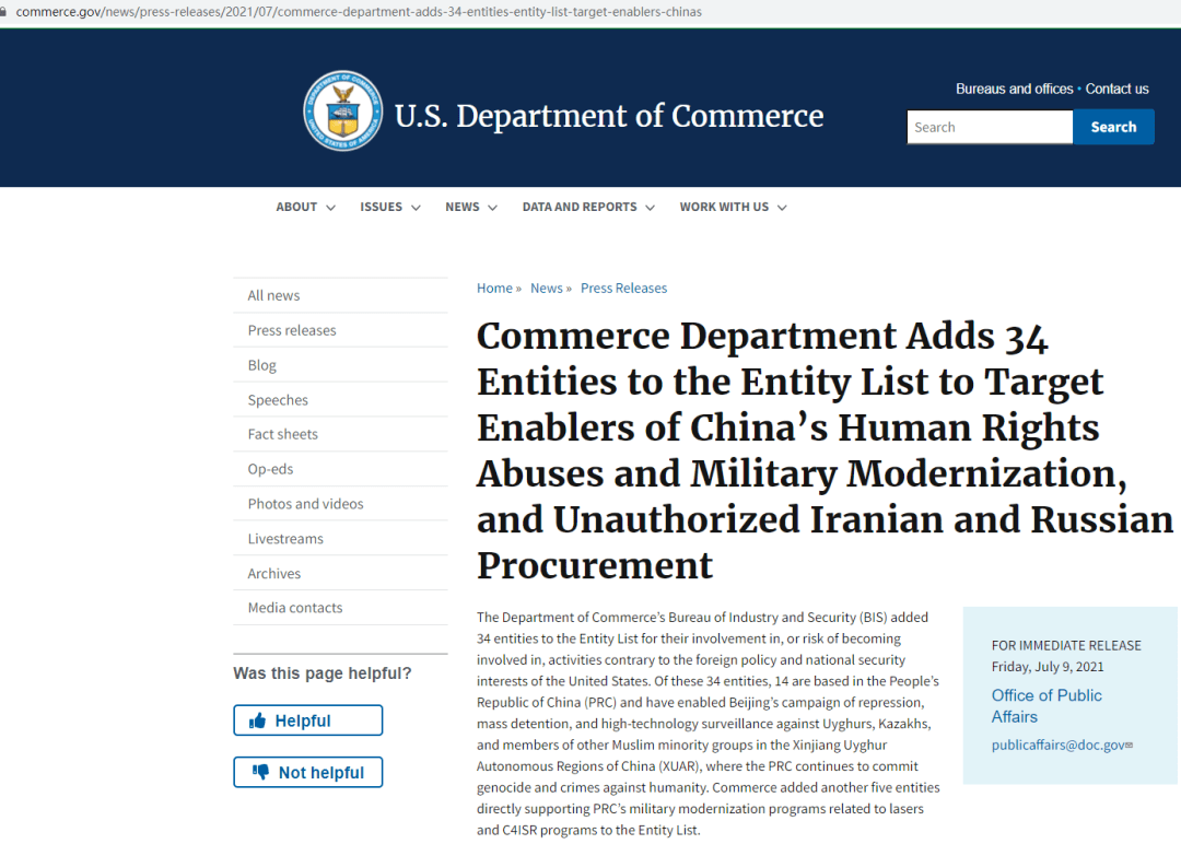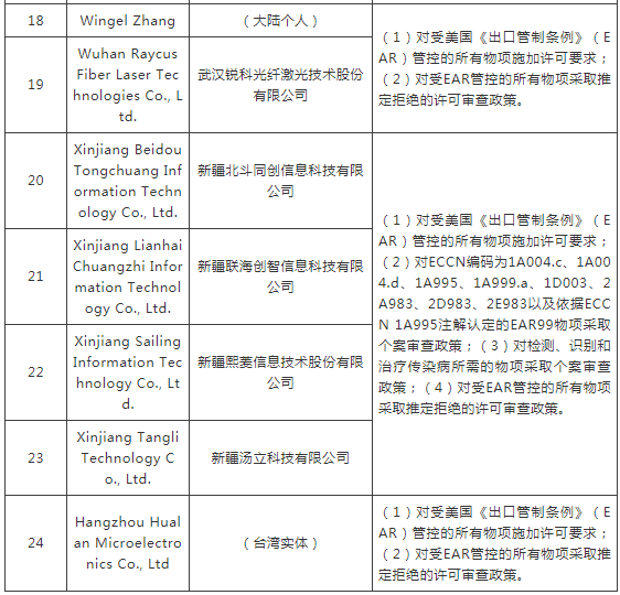就在這個月的7月12日,美國商務(wù)部產(chǎn)業(yè)與安全局(BIS)通過《聯(lián)邦政府公報(bào)》(Federal Register)發(fā)布了一項(xiàng)最終規(guī)則(final rule),來自中國的24個實(shí)體/個人從事或促成了有違美國國家安全或外交政策利益的活動,因而將其列入“實(shí)體清單”。被列入清單的理由、列入后的許可要求和許可審查政策如下。