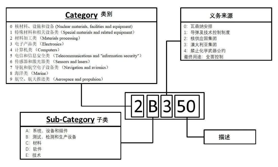 歐盟出口管制物項(xiàng)ECCN的第一、第二位數(shù)字排序與美國ECCN一致,都延續(xù)了《瓦森納協(xié)定》的規(guī)定。第一位數(shù)字為物項(xiàng)的分類,分為0~9類物項(xiàng);第二列數(shù)字為物項(xiàng)的種類:A代表“系統(tǒng)、設(shè)備和部件”,B代表“測試、檢查和生產(chǎn)設(shè)備”,C代表“材料”,D代表“軟件”,E代表“技術(shù)”。后三位是對產(chǎn)品的描述,其中歐盟ECCN第三位數(shù)字指明該物項(xiàng)出口管制的義務(wù)來源,說明是出自何種國際共識。